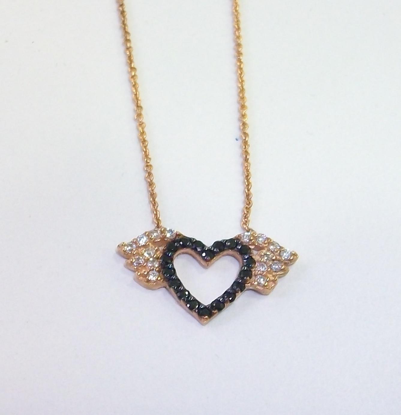 Pink gold 14k Neclace Heart with Angel wings design nailed with black and white zirgon.